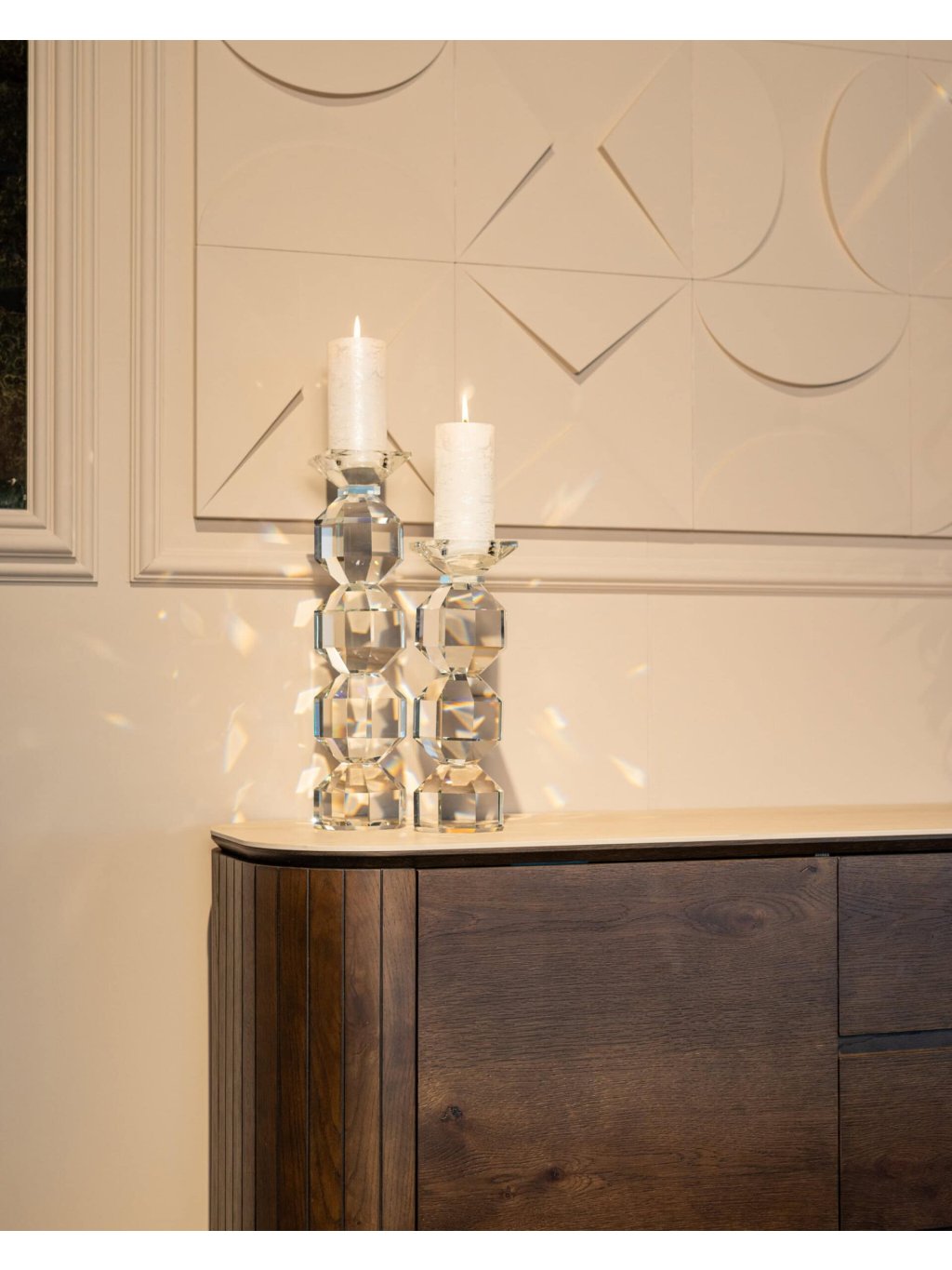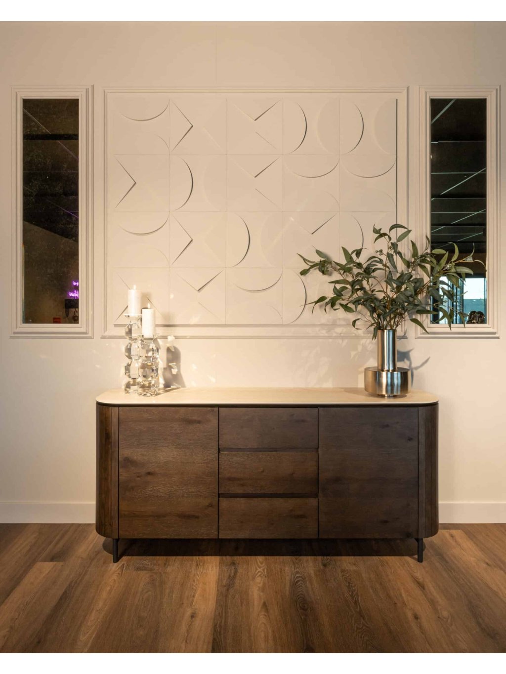 Materiál: Dubová dyha, MDF, recyklované drevo, travertínová keramika