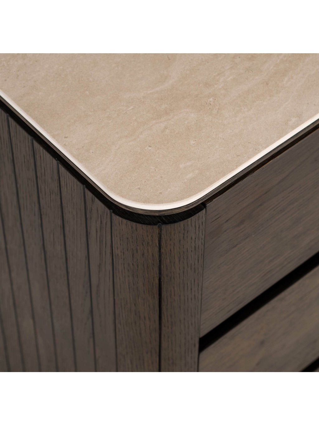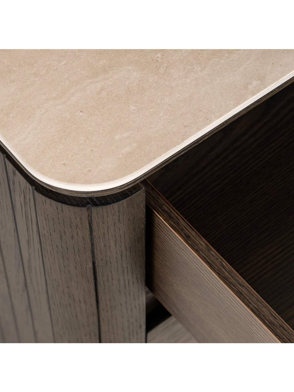 Materiál: Dubová dyha, MDF, recyklované drevo, travertínová keramika, kov